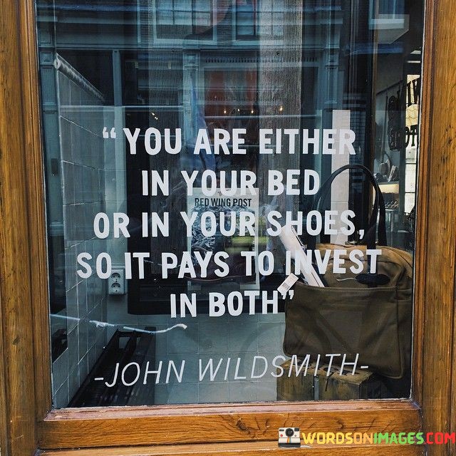 This quote emphasizes the significance of rest and productivity in life. It suggests that since people are either in bed or wearing shoes, it's worthwhile to prioritize both aspects. The phrase "you are either in your bed or in your shoes" highlights the dichotomy between rest and activity.