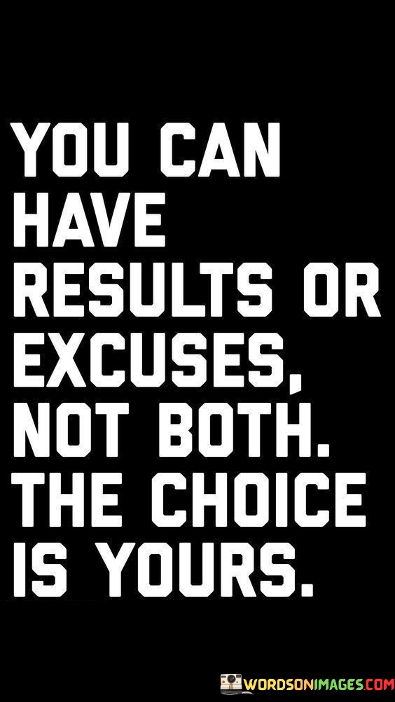 The quote highlights personal responsibility and decision-making. It implies that success hinges on individual choices. By stating "the choice is yours," it underscores the power of deciding whether to prioritize effort and outcomes or to lean on excuses.