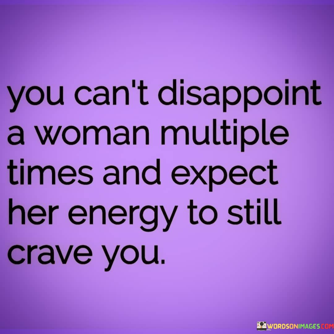 This straightforward statement emphasizes the consequences of repeatedly disappointing a woman in a relationship. It suggests that if someone consistently fails to meet a woman's expectations or hurts her, she will eventually lose interest and stop investing her energy in that person.