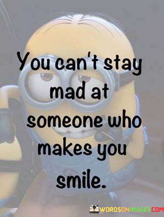 The phrase "you can't stay mad at someone" acknowledges the difficulty of holding onto anger in the face of positive feelings.