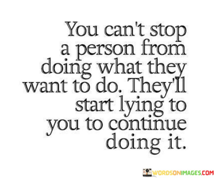 This quote delves into the dynamics of human behavior and autonomy. It suggests that individuals are driven by their desires, and attempting to prevent them can lead to deception. By stating "you can't stop a person from doing what they want to do," it underscores the innate drive to pursue personal wishes, which can sometimes override external constraints.