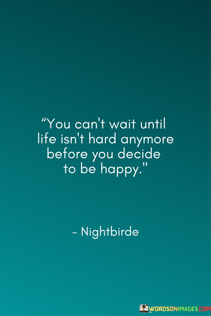 The quote delivers a powerful message about finding happiness amid life's challenges. "You can't wait until life isn't hard anymore before you decide to be happy" emphasizes the importance of choosing happiness despite difficult circumstances.