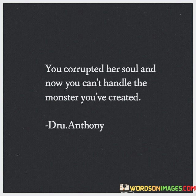 The quote "you corrupted her soul and now you can't handle the monster you've created" conveys a poignant message about the consequences of mistreating or manipulating someone's emotions and spirit. It paints a picture of a person who, through their actions, has caused profound harm and damage to another individual's inner being. The phrase "corrupted her soul" suggests that the actions of the perpetrator have had a significant negative impact on the person's sense of self, values, and emotional well-being. The term "monster" here symbolizes the profound transformation that has occurred within the individual as a result of the mistreatment they endured. It may refer to the inner turmoil, pain, or anger that has surfaced within the person who was hurt. The quote alludes to the idea that the person responsible for causing this harm may now find themselves unable to cope with the consequences of their actions, as they witness the aftermath of the damage they inflicted on the other person's psyche. This quote serves as a cautionary reminder of the lasting effects of mistreatment and the importance of treating others with compassion, respect, and empathy, as our actions can profoundly impact the souls of those we interact with. It also speaks to the significance of taking responsibility for one's actions and acknowledging the potential harm caused by manipulating or playing with someone's emotions and inner self.
