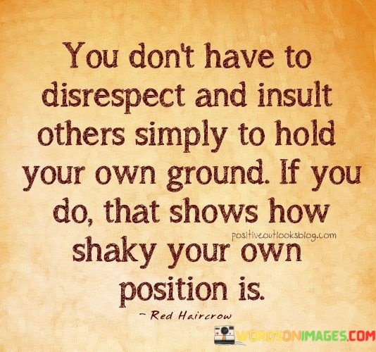 The quote addresses maintaining one's position without resorting to disrespect. It suggests that insulting others to assert oneself indicates insecurity in one's stance. This viewpoint underscores the importance of maintaining confidence without diminishing others.
