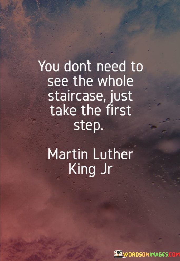 The quote speaks to the notion of starting despite uncertainty. It suggests that progress begins by taking the initial step, even without a clear view of the entire journey. This viewpoint underscores the importance of overcoming hesitation and beginning the path to achievement.