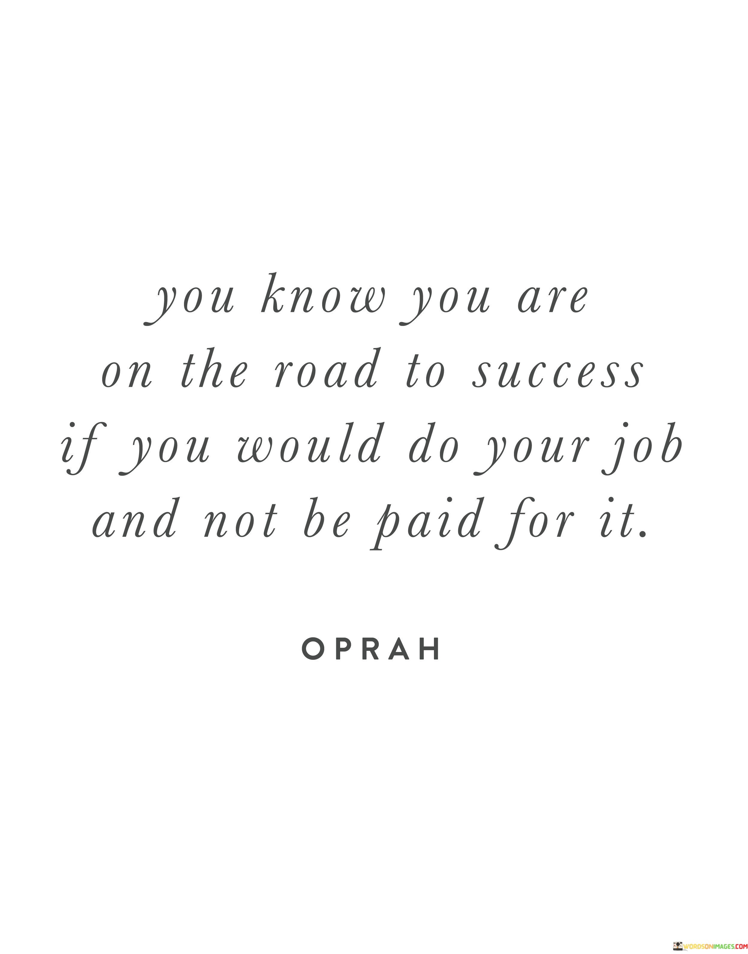 The quote underscores the importance of passion. It implies that when individuals are so passionate about their work that they would do it without compensation, they are likely aligned with their purpose and on a successful trajectory.