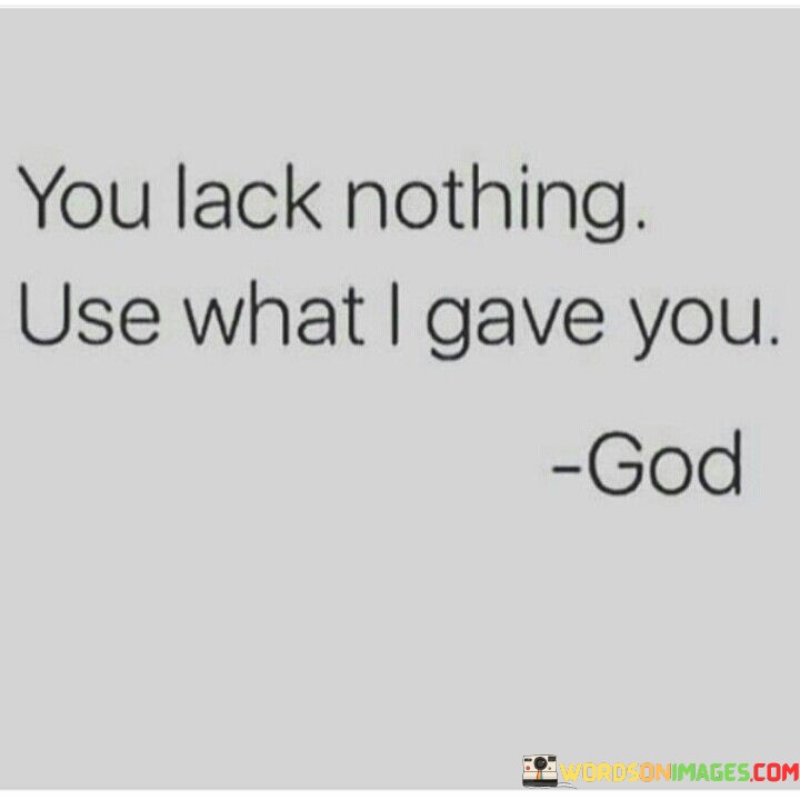 The quote "You lack nothing. Use what I gave you" conveys the message that individuals possess the necessary resources, talents, and abilities to fulfill their purpose and achieve their goals in life. It encourages people to recognize and appreciate their inherent potential and the gifts they've been endowed with.