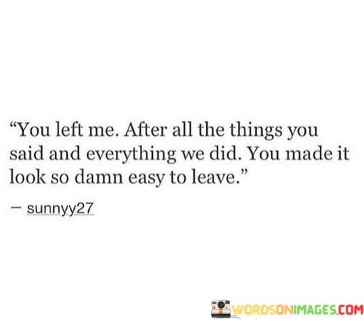 The quote conveys the sense of betrayal and abandonment. "You left me" signifies the action. "After all the things you said and everything we did" highlights the contradiction between words and actions. The quote conveys the emotional turmoil of feeling deceived.