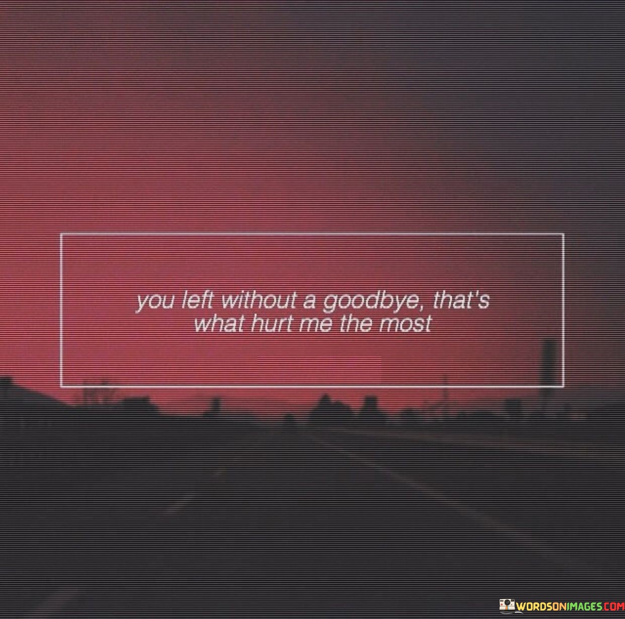 The quote underscores the significance of closure in relationships. It highlights the emotional turmoil caused by the absence of a proper farewell. "Hurt me the most" reflects the emotional scar left by the sudden departure, emphasizing the need for understanding and closure.