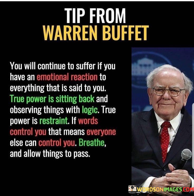 The quote emphasizes emotional mastery. It suggests that reacting emotionally to every remark leads to suffering. True strength lies in calmly observing situations with logic. Exercising restraint and not letting words dictate reactions empower you to avoid external control. The quote underscores the importance of self-control and maintaining a composed perspective.