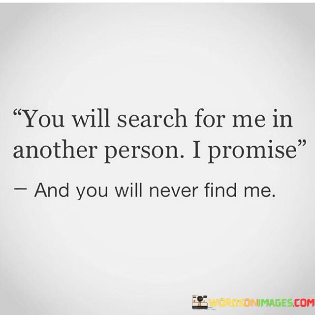 The quote, "You Will Search For Me In Another Person I Promise, and You Will Never Find Me," speaks to the tendency to seek familiarity and emotional resonance in others after a breakup. It implies that while new relationships may offer similarities, they won't capture the essence of the original bond.