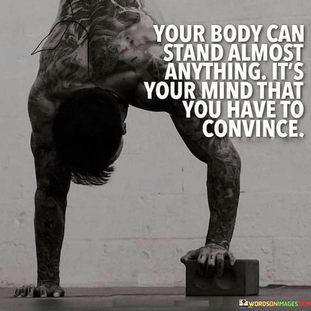 The quote "Your body can stand almost anything; it's your mind that you have to convince" emphasizes the incredible power of the human mind in overcoming physical challenges and pushing past perceived limitations. It reminds us that the real battleground for achieving our goals and breaking barriers lies within our own minds, as our mental attitude and beliefs play a significant role in determining our ability to endure and succeed. The human body is capable of remarkable feats of strength, endurance, and resilience. It can withstand physical stress and adapt to various demands placed upon it. However, the body's potential is often limited by the mindset of the individual. Our thoughts, beliefs, and self-perceptions shape our reality, influencing how we perceive our capabilities and respond to adversity. To achieve extraordinary feats or surpass physical barriers, it is essential to conquer the doubts and negative self-talk that often arise in our minds. The quote suggests that the true challenge lies in convincing our minds that we are capable of more than we may believe. By cultivating a strong and determined mindset, we can push past discomfort, fatigue, and doubt to achieve our goals. Furthermore, the quote highlights the role of mental toughness in achieving success. Mental resilience and fortitude enable individuals to stay focused and determined even when faced with challenges or obstacles. By developing a positive and unwavering mindset, individuals can tap into their inner strength and push their bodies beyond what they previously thought possible. The quote also emphasizes the importance of self-belief and confidence in achieving physical feats. When we believe in our abilities and trust in our training or preparation, we are more likely to push ourselves to new heights and persevere through challenging circumstances.