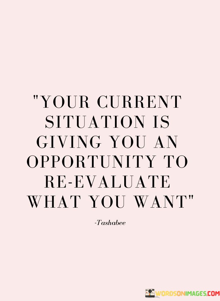 This quote highlights the potential for growth in challenging times. In the first part, "your current situation is giving you an opportunity," it emphasizes the silver lining within difficulties. The second part, "to reevaluate what you want," suggests that challenges prompt reflection on desires and goals.
