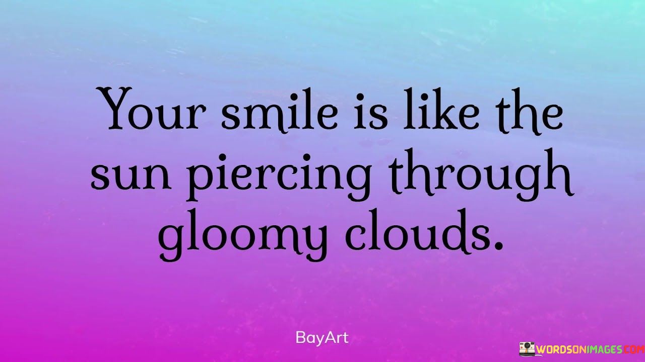 "Like the sun piercing through gloomy clouds" compares the impact of the smile to the way sunlight breaks through dark clouds, bringing light and warmth.