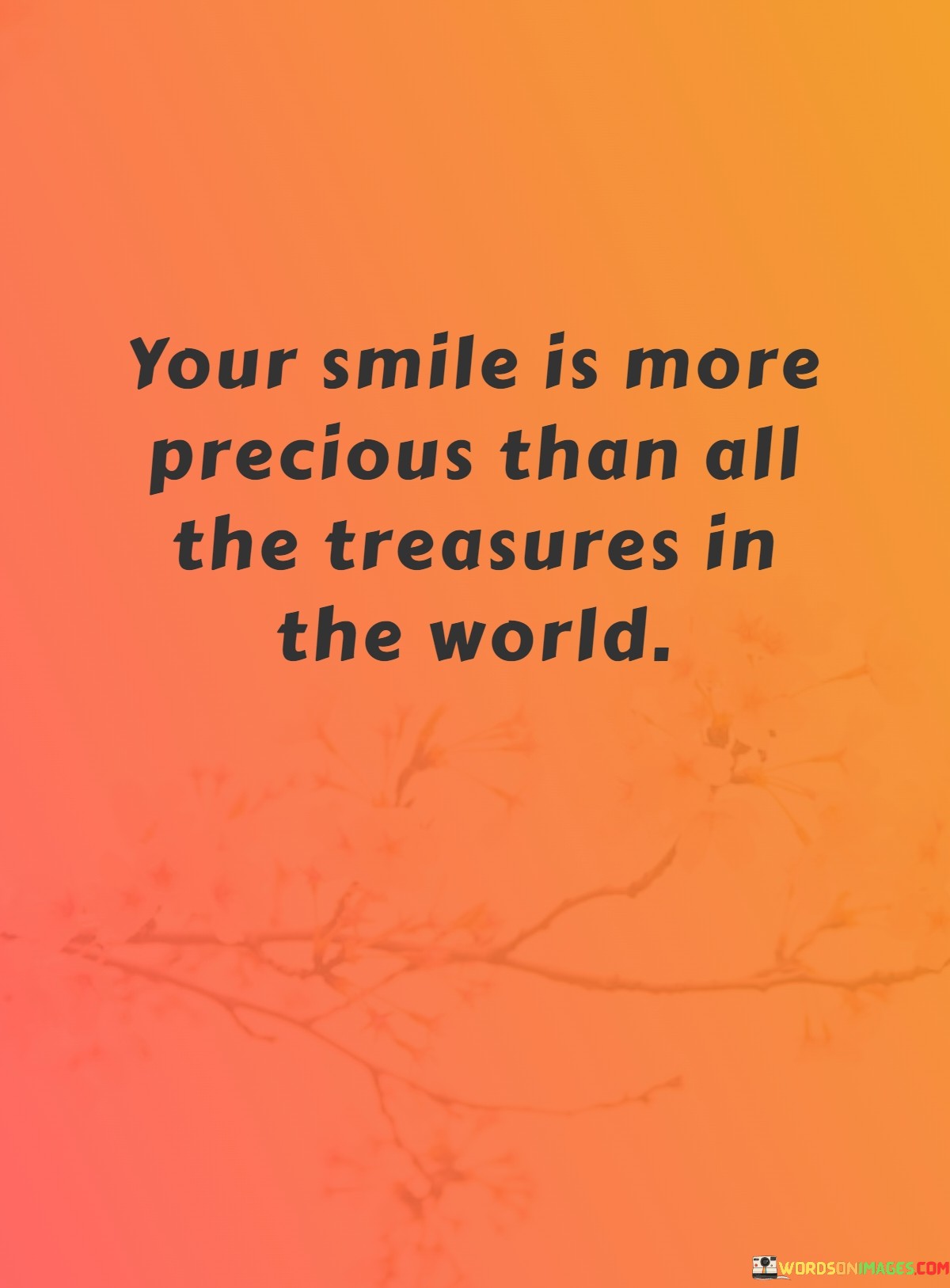 The quote speaks to the depth of emotion and connection that a smile can elicit. By placing the person's smile on a pedestal above worldly riches, it signifies the profound impact that their happiness has on the speaker's heart.