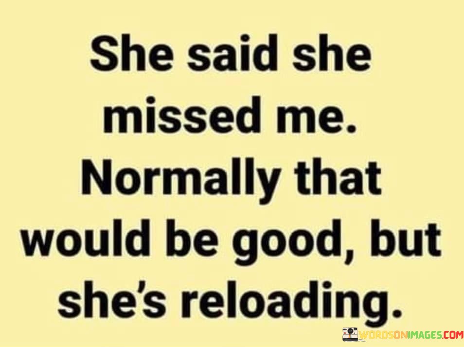 This clever and intriguing quote suggests that the speaker is cautious or wary of someone expressing affection towards them. The phrase "she said she missed me" indicates that the person conveyed feelings of longing or nostalgia, which typically would be considered a positive expression in a relationship. However, the latter part of the quote, "normally that would be good but she's reloading," adds a twist to the sentiment. The word "reloading" implies that the person expressing their feelings might have hidden intentions or ulterior motives. It suggests that the person may be preparing to take advantage of the speaker's emotions or vulnerability, similar to how one reloads ammunition to ready a weapon. This quote serves as a warning against naively accepting displays of affection without considering the context or potential hidden agendas of the other person. It emphasizes the importance of being discerning and cautious in relationships, recognizing that not all expressions of fondness may come from a place of sincerity. By using a play on words with "reloading," the quote cleverly conveys the idea of arming oneself emotionally to protect against potential harm or manipulation. Ultimately, this quote cautions against taking expressions of affection at face value and encourages the listener to stay vigilant in their interactions, ensuring that their emotional well-being remains safeguarded in relationships.